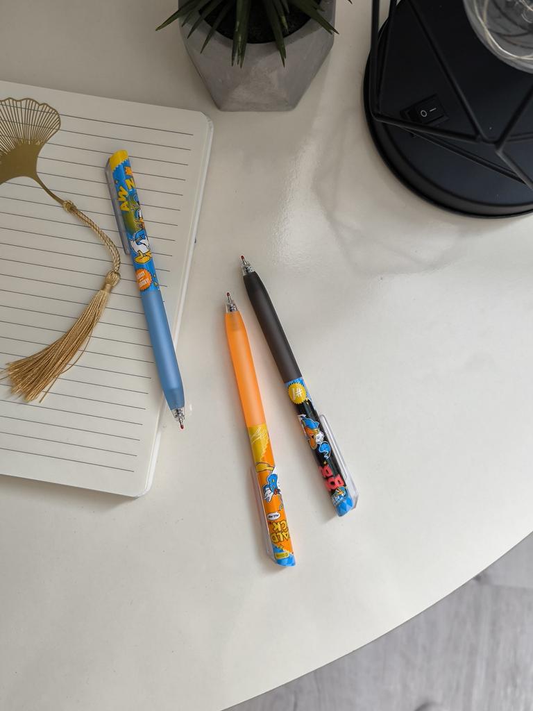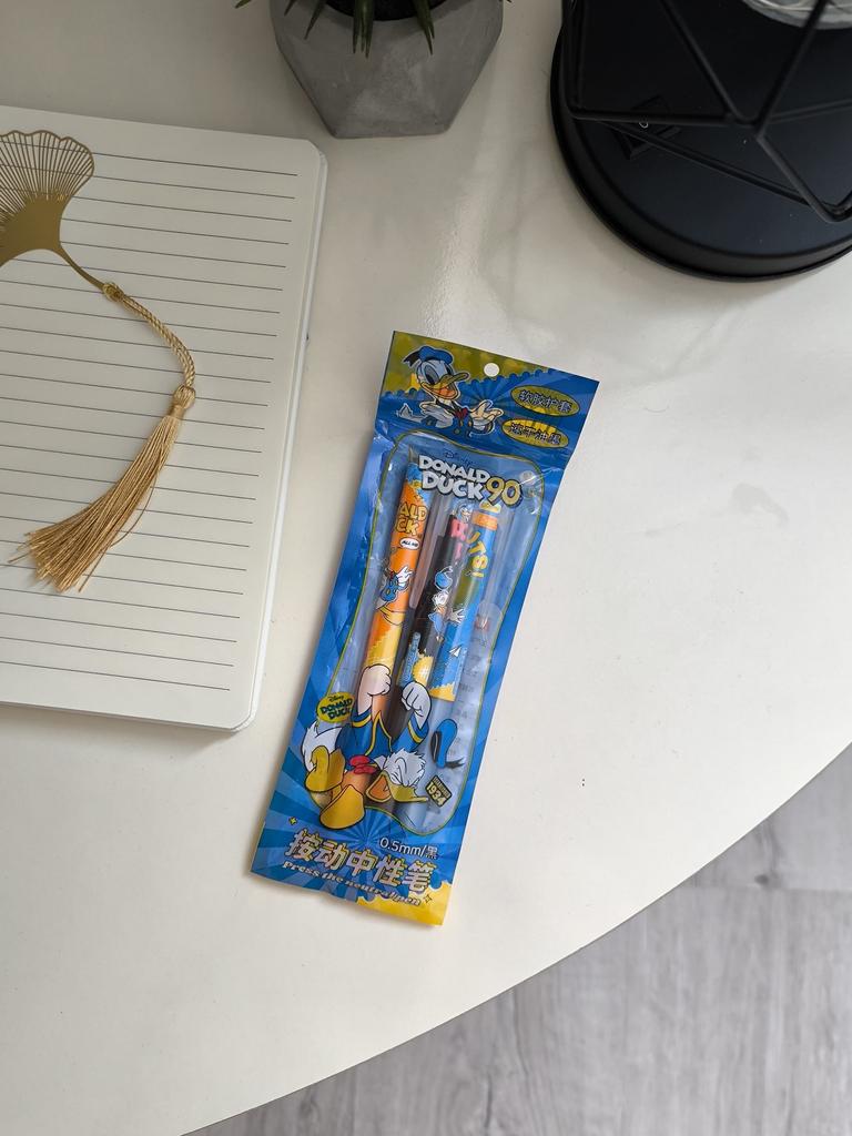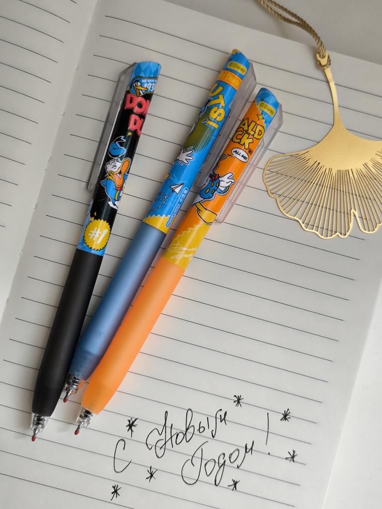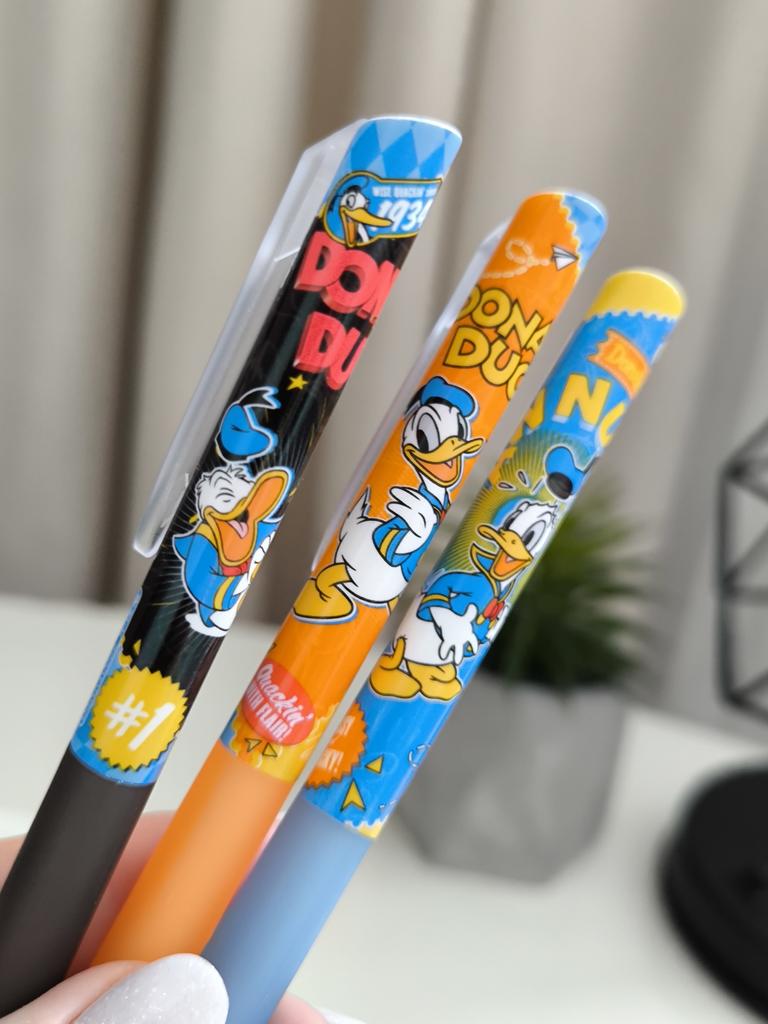 Set aus drei Gelstiften mit Donald Duck Guter Preis! Gute Qualität. Mit Druckknopfmechanismus. Farbe schwarz. Ich empfehle 🤗