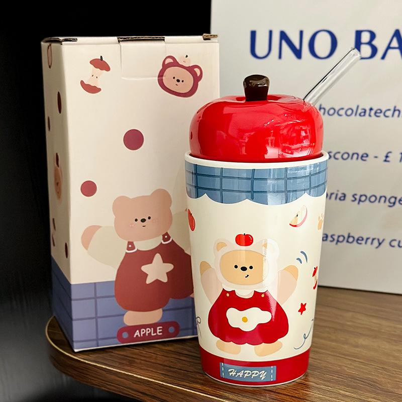 Niedlicher Cartoon Bär Apfelform Keramiktasse mit Deckel Heim Strohhalmbecher Weihnachtsgeschenk Souvenir