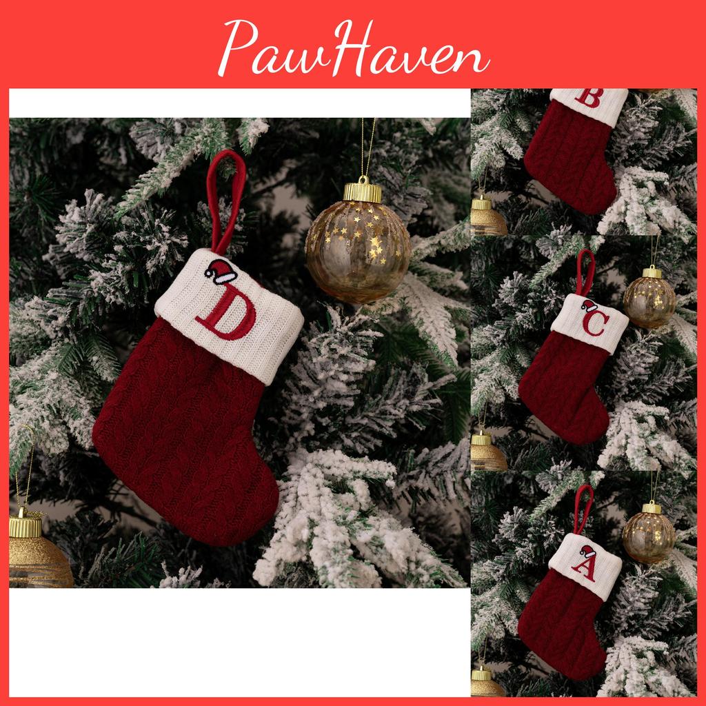 Exquisite rote gestrickte Weihnachtsstrümpfe mit gestickten Buchstabenmustern für festliche Dekoration