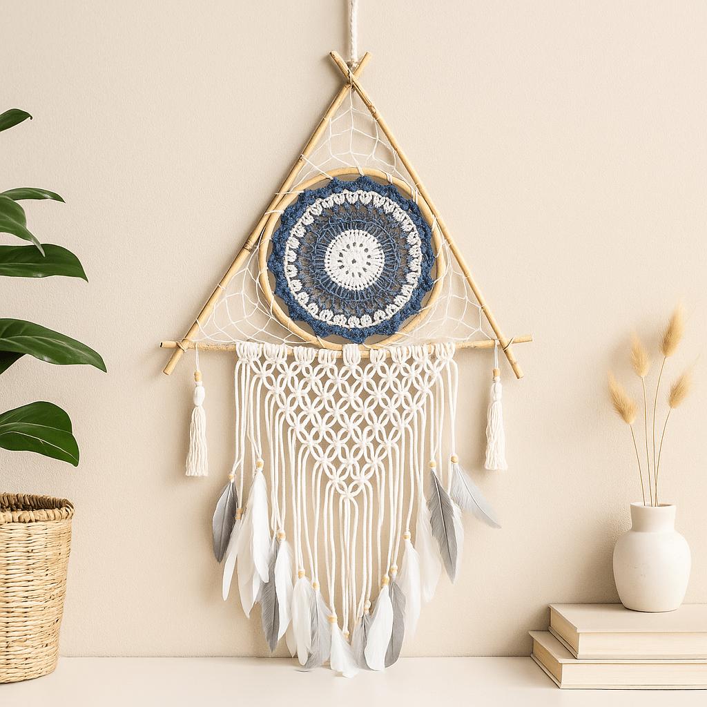 A triangle cradles a laced circle, pale as morning light. Handwoven in Indonesia, this wall hanging brings two quiet symbols together—the soft web of a dreamcatcher and a blue-centered gaze that hints at a protective eye. It feels calm, tender, and thoughtfully made. 🌙