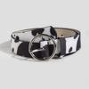 This fashion belt features a vintage cow print pattern made from durable faux leather, The alloy buckle with a pin closure enhances its stability and style, showcasing a modern animal motif. Ideal for casual outfits and denim looks. Wipe clean with a damp cloth to maintain its finish.