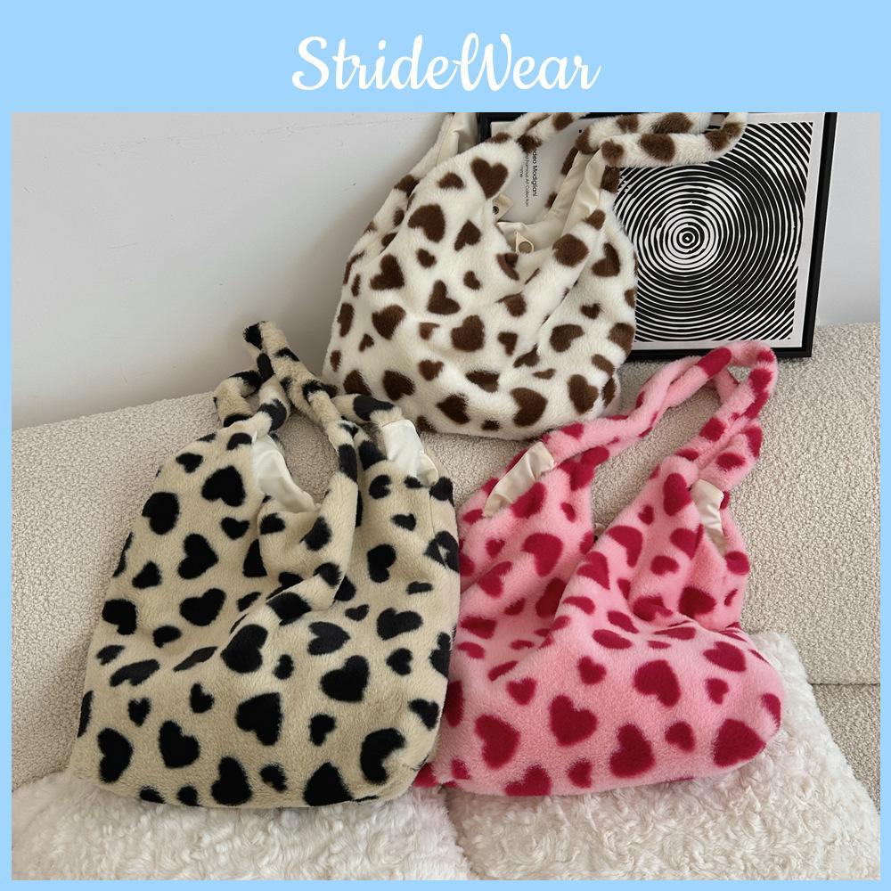 Designed for the modern woman, this tote bag showcases street fashion at its finest. The plush texture and heart motif align perfectly with contemporary trends, making it a fashionable item thats both fun and functional. The dual shoulder straps provide ample support and comfort, allowing you to carry your bag with ease while enjoying your daily adventures. This medium-sized tote is ideal for everyday use, offering enough space to hold your essentials without feeling bulky or cumbersome.