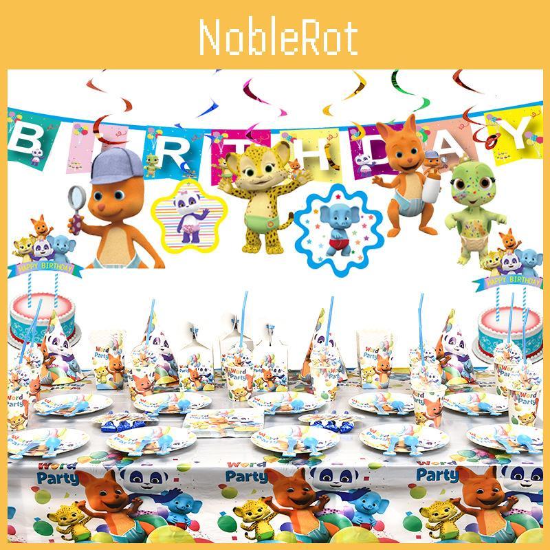 Entzückendes Wortparty-Themenparty-Zubehörset mit bunten Tellern, Bechern und fröhlicher Geburtstagsdekoration