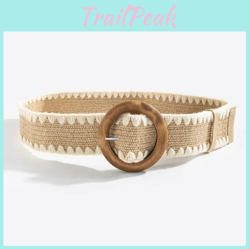 This bohemian-style women's belt features a natural straw woven design with a durable plastic buckle, measuring 5 CM wide and 102CM long. Crafted with handwoven techniques, it offers stretchability and a versatile fit suitable for casual or vacation wear. Ideal for resort outfits, it can be cleaned with a damp cloth for maintenance.