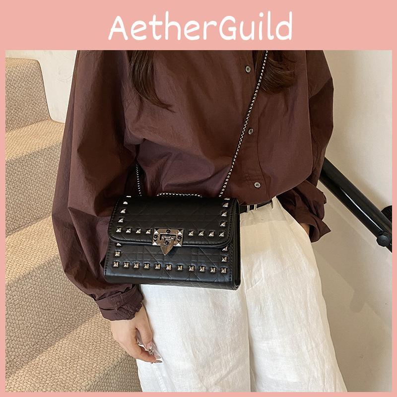 Chic Design: This eye-catching small square shoulder bag features stylish rivets and a trendy chain for a fashionable look, perfect for any casual outing or street-style ensemble.