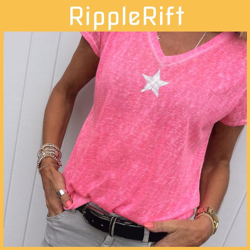 Damen V-Ausschnitt T-Shirt Casual Loose Star Sommer Shirts Solid Kurzarm Neu