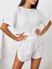 Erleben Sie ultimative Entspannung mit diesem zweiteiligen Hausanzug-Set, bestehend aus einem locker sitzenden Kurzarm-Oberteil und passender Hose. Dieses Pyjama-Set aus weichem und atmungsaktivem Polyester ist perfekt, um faule Sommertage oder gemütliche Nächte darin zu genießen.. Sein klares, weißes Design verleiht Ihrer Loungewear-Kollektion einen Hauch von Frische und sorgt dafür, dass Sie bequem und stilvoll bleiben.
