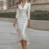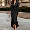 Damen Modisches Elegantes Einfarbiges Langärmeliges V-Ausschnitt Satin-Kleid