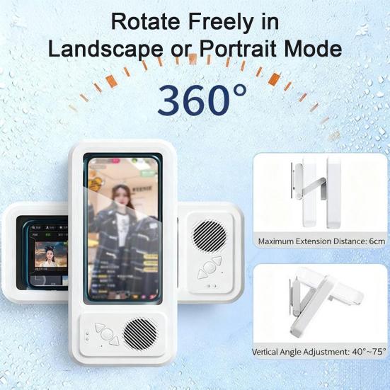 Einstellbare 480-Grad-Drehung für optimale Sicht: Diese wasserdichte Handybox für das Badezimmer verfügt über einen flexiblen Ständer, der sich bis zu 480 Grad drehen lässt, sodass Sie Ihr Telefon im perfekten Winkel einstellen können.. Ob beim Ansehen von Videos, beim Telefonieren oder beim Musikhören, Sie können während Ihrer Dusch- oder Badezeit freihändigen Komfort und maximalen Komfort genießen.