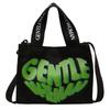 The bag is available in six chic color combinations, including black and red, black and white, black and green, white and red, white and black, and white and green. Made from durable canvas material, this tote bag is both practical and stylish. The small size is easy to carry, while the bold lettering adds an interesting and unique element to the design. Magnetic latches ensure that your items remain secure, while open pockets on the outside provide convenience for essentials such as your cell phone.
