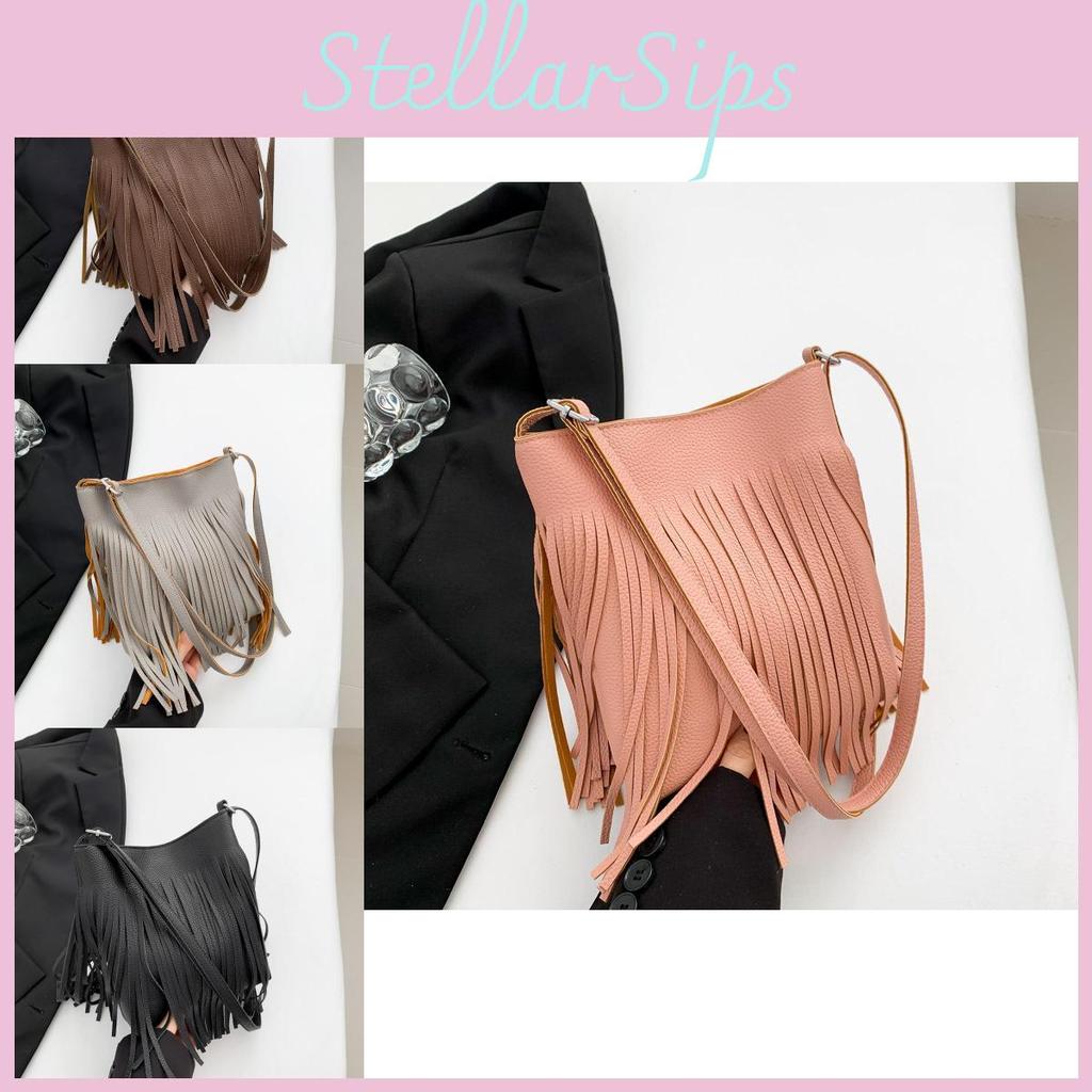 Vintage Style Bucket Bag For Women With Trendy Fringes And Casual Design In Black Gray Brown Pink And White