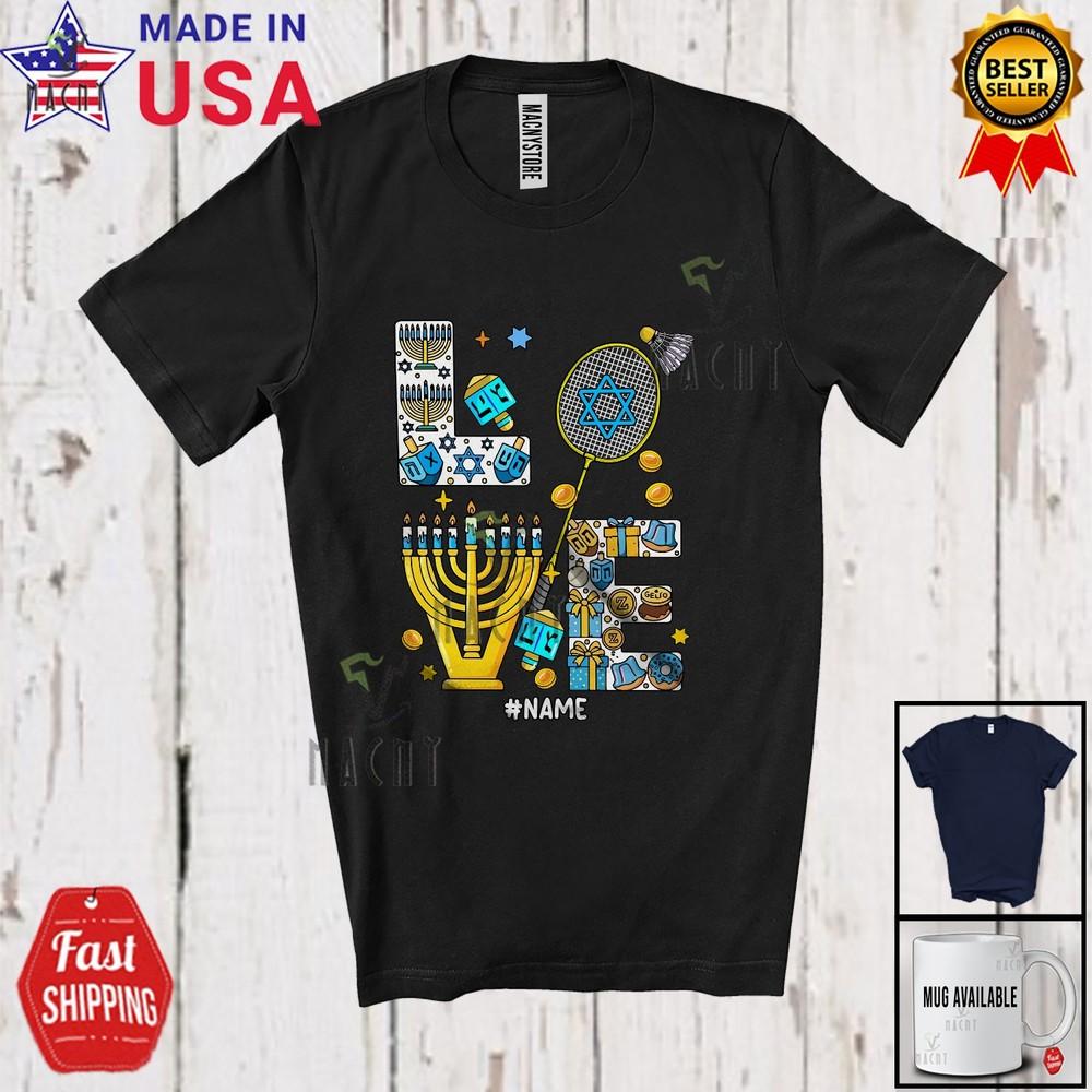 Benutzerdefinierter Name LIEBE Reizende Chanukka Menora Badmintonspieler Sport Spiel T-Shirt