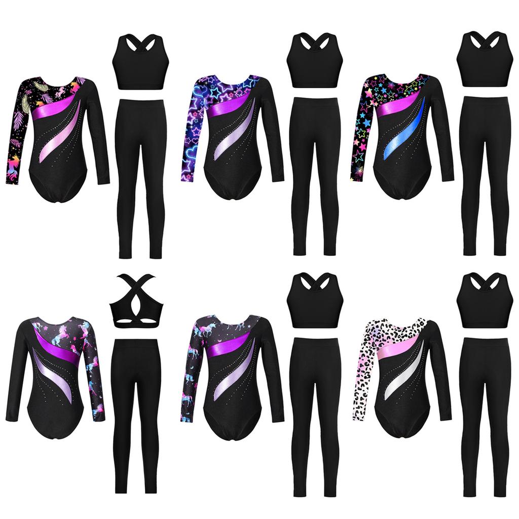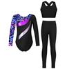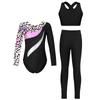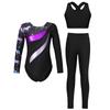 3-teiliges Turnset für Mädchen: Langärmliger Metallic-Patchwork-Turnanzug mit gekreuztem Rückenteil und Leggings