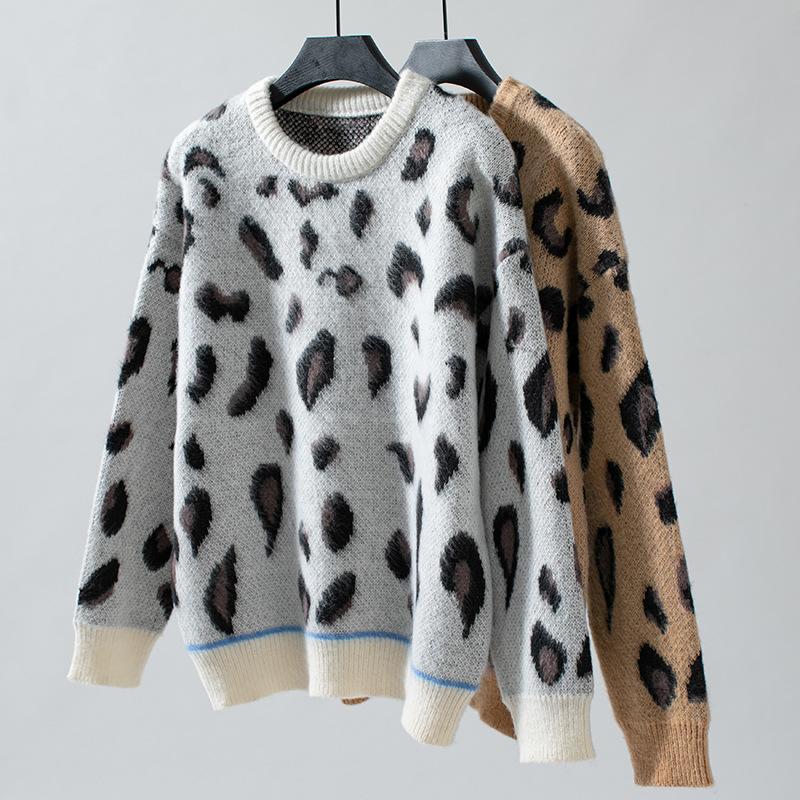 Damen Strickwaren Herbst und Winter Locker Rundhals Gebürsteter Leopardenmuster Jacquard Pullover