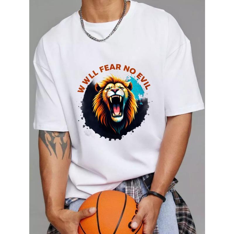 Weißes T-Shirt mit Löwengrafik und We Will Fear No Evil Text für Freizeitkleidung