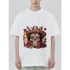 Mexikanischer Tag der Toten Schädel T-Shirt Schwarz Bunter Zuckerschädel mit Sombrero Rosen Chilischoten Tequilaflasche und Cocktail-Aufdruck für Party Festival