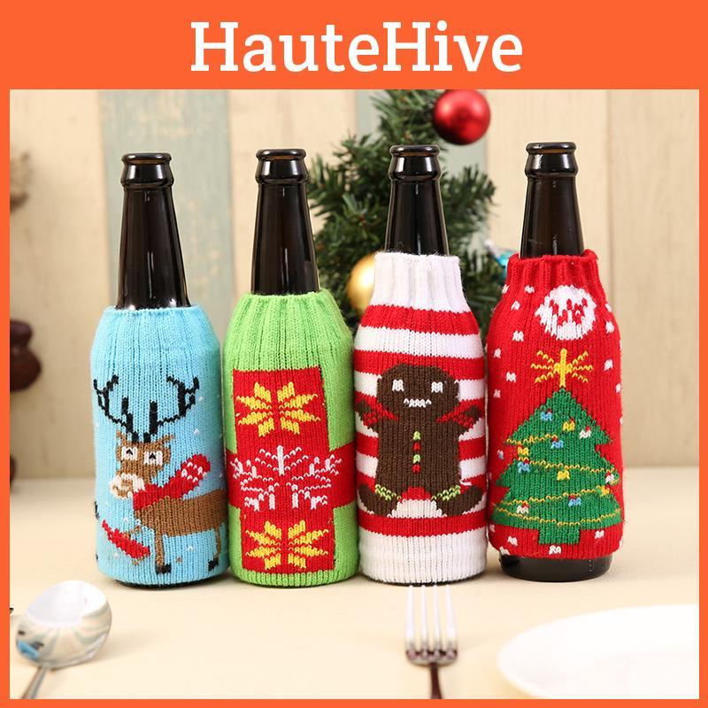 Hochwertiges gestricktes Weihnachts-Bierflaschenhüllen-Set mit festlichen Schneeflocken- und Rentier-Designs zur Feiertagsdekoration