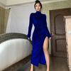 European & American Style Women's High-Neck Velvet Long Dress - Slim Fit, Pleated, Slit Design for Autumn/Winter 2022