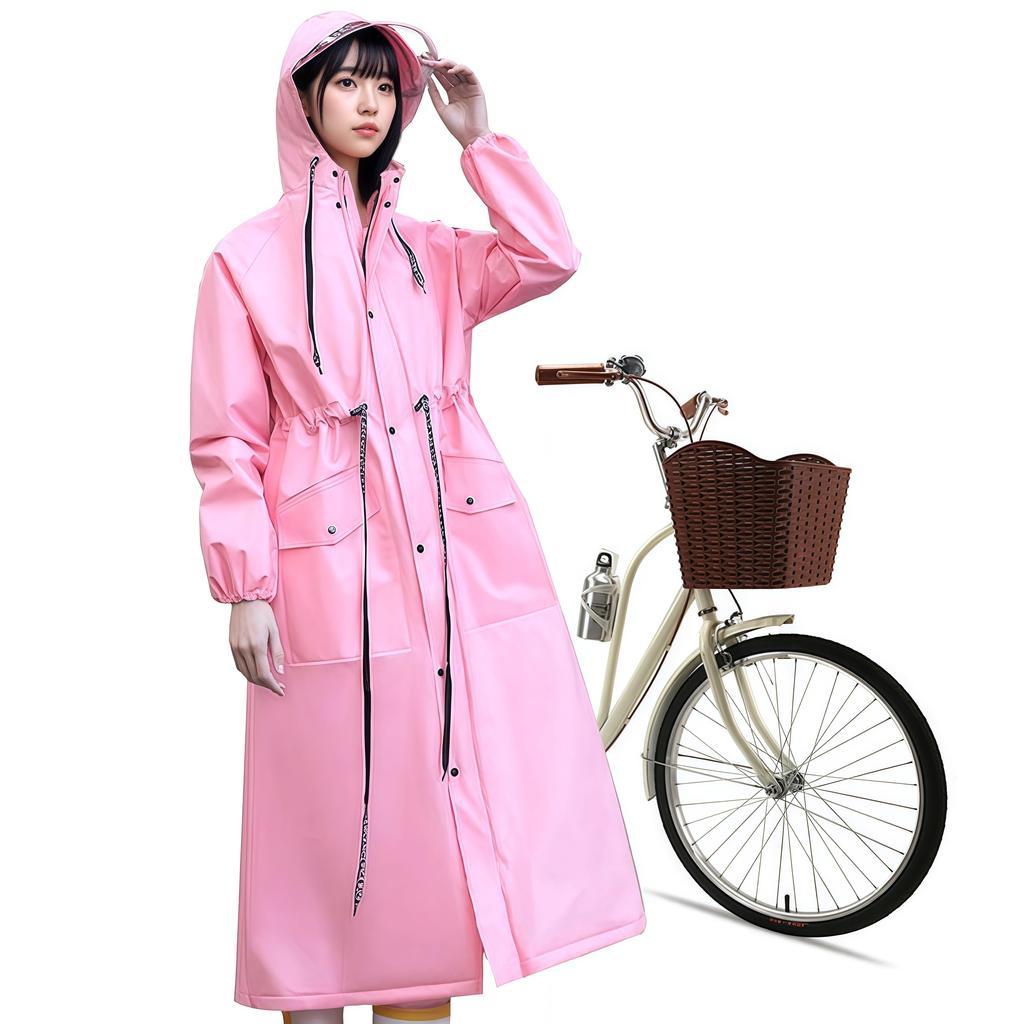 [Perfect for cycling and urban walking commutes!] (1) Removable clear visor! It leaves both hands free for safe cycling, even in the rain. Keeping your face dry means you don't have to worry about your makeup running. (2) The hood has an adjustable elastic belt. Easily adjust the fit around your head and provide excellent wind and rain protection. (3) Elasticated sleeves on the inside protect your hands from the rain. The hem extends below the chain for easy movement. The high collar makes it suitable for both rainy and windy weather. (4) Fully waterproof, with all seams waterproofed. (5) The waterproof chain is smooth and waterproof. (6) The vertical pockets are convenient and invisible. (7) Adjustable pleats, with the waist pleats tightened to reduce wind resistance.