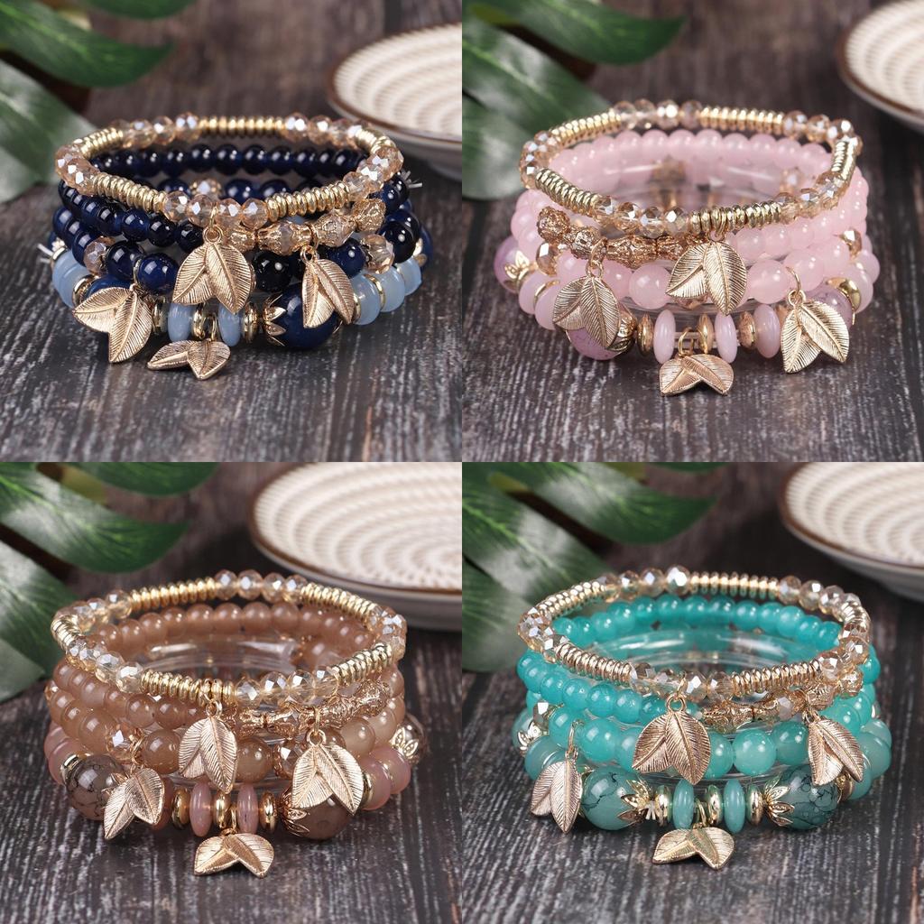 Böhmisches Blatt - Ethnischer Anhänger Elastische Kordel Perlen Mehrsträngiges Armband