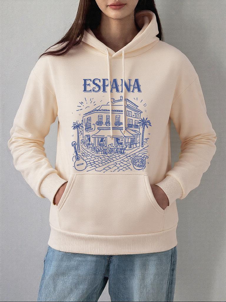 Spanien Lokale Straßenszene Drucke Kapuzenpullover Damen Lässig Locker Sweatshirt Winter Fleece Warm Pullover Basics Tasche Damenkleidung