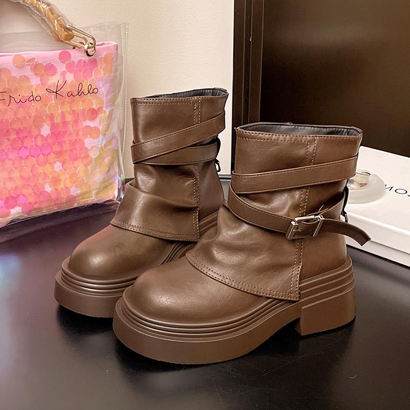 Knöchelhohe Stiefel für Damen mit mittleren Absätzen Designerschuhe Schnalle Trend Winterstiefel Neu Walking-Plateau Leder Sport Mujer Botas