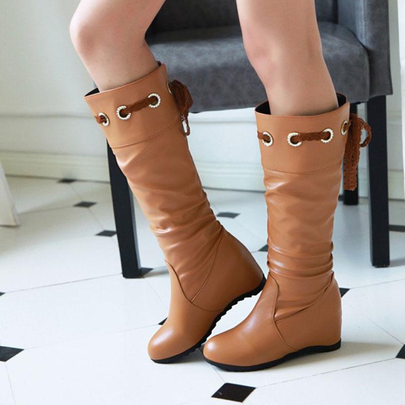 Autumn Winter Fashion Boots for Woman Elevator Shoes Women Round Toe Lace-up Knee High Boots bottes femmes Large Size WSH5432