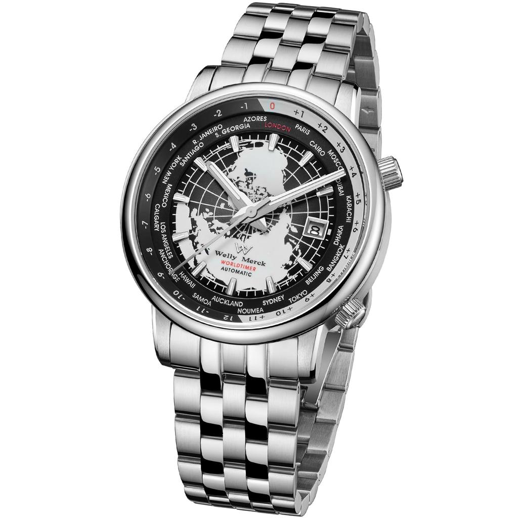 Herrenuhr mit Weltzeitfunktion, 100M Wasserdichtigkeit, Schlicht, Stilvoll, Beliebt und Formell - WM057 - Silber Schwarz
