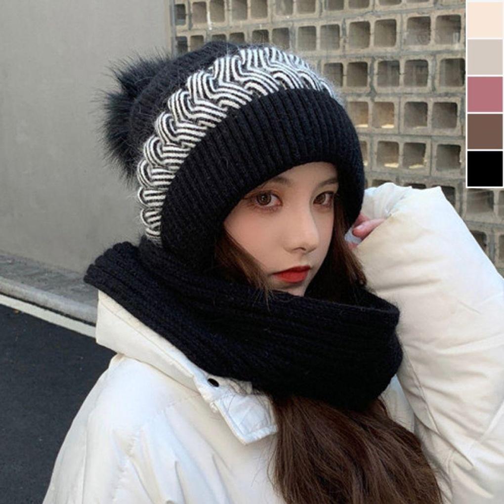 Two-tone tweed muffler, warm scarf, fur beanie hat