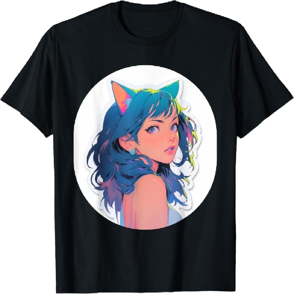 Blue Hair Anime & Manga Style Cat Girl In Light Blue Top T-Shirt