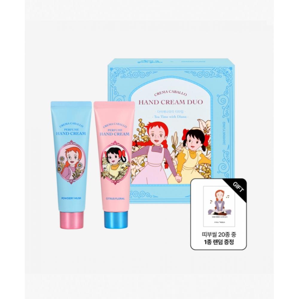 The JAMINKYUNG Red Hair Anne Edition Crema Cavallo Hand Cream Duo (30ml x 2) features Powdery Musk and Citrus Floral scents, both designed to provide soft and moisturized care for the hands. It absorbs quickly after use, leaving no sticky residue and a refreshing finish. Experience the delightful combination of two captivating fragrances.
