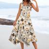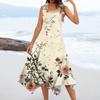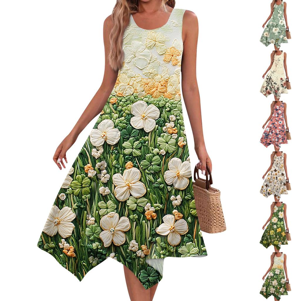 Lässiges, modisches Damen-Midikleid mit Rundhalsausschnitt, ärmellos, Blumendruck, unregelmäßiger Saum