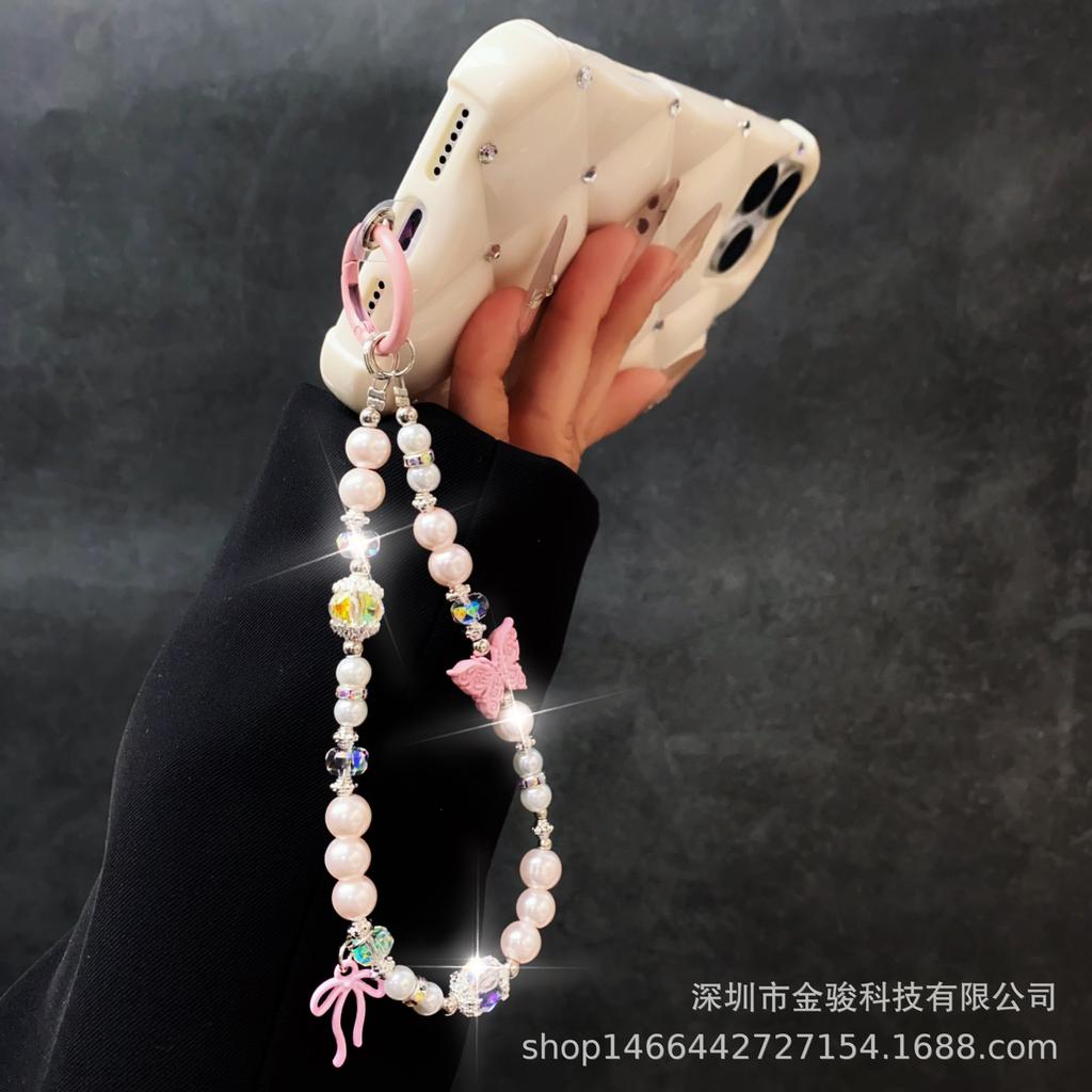 Ins Style Alloy Butterfly Phone Chain Rope Handmade Beaded Hanging Chain Pearl Keychain Bag Hanging Rope Pendant Rope Accessories