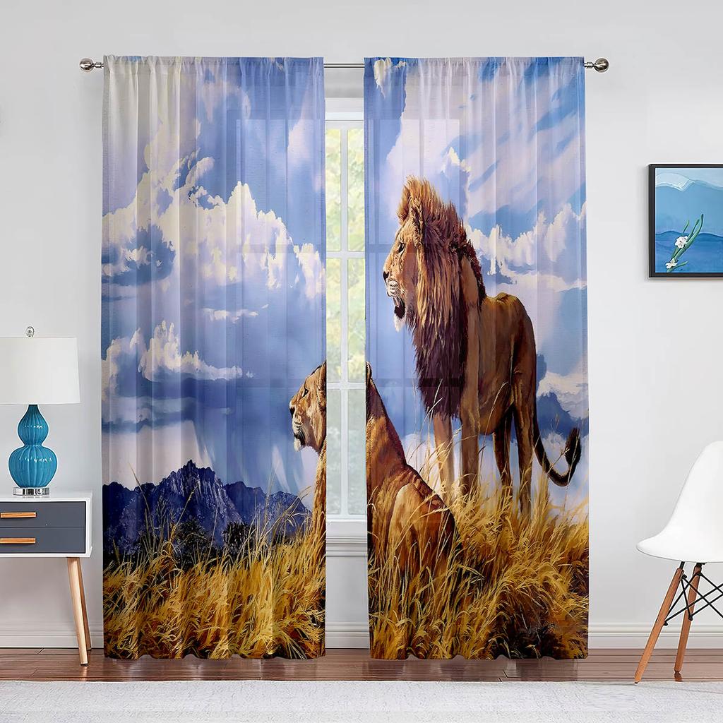 Löwenpaar Landschaftsmalerei Wolken Wildtiere Transparente Vorhänge für Wohnzimmer Schlafzimmer Küchendekor Fenstervoiles Tüllvorhang