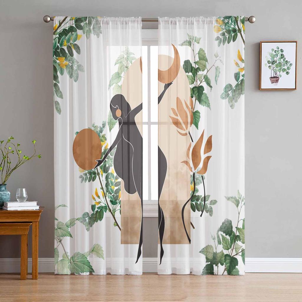 Böhmischer abstrakter weiblicher Silhouette-Blatt-Aquarell-Tüll-Fenstervorhang für Schlafzimmer, Luxus-Vorhänge im Wohnzimmer, Chiffon-Paneele