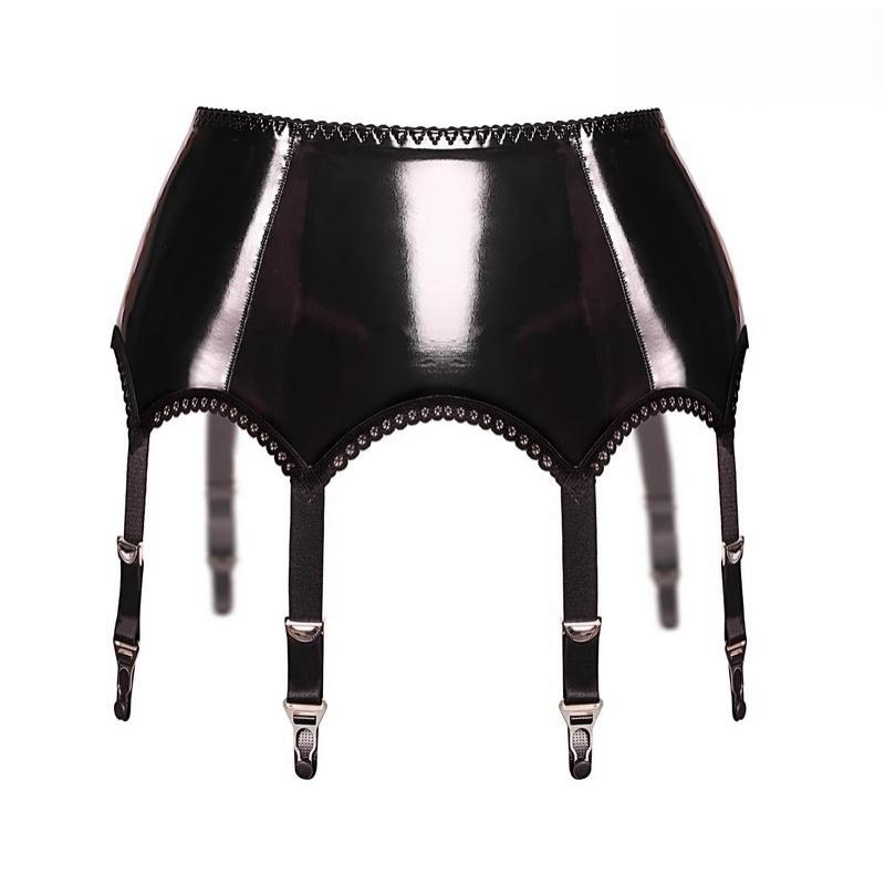 Gothic Wet-Look PVC Leder Hohe Taille Hosenträger Offener Schritt Exotische Dessous Clubwear Nachtclub Sexy Strumpfbandgürtel mit 6 Strümpfen