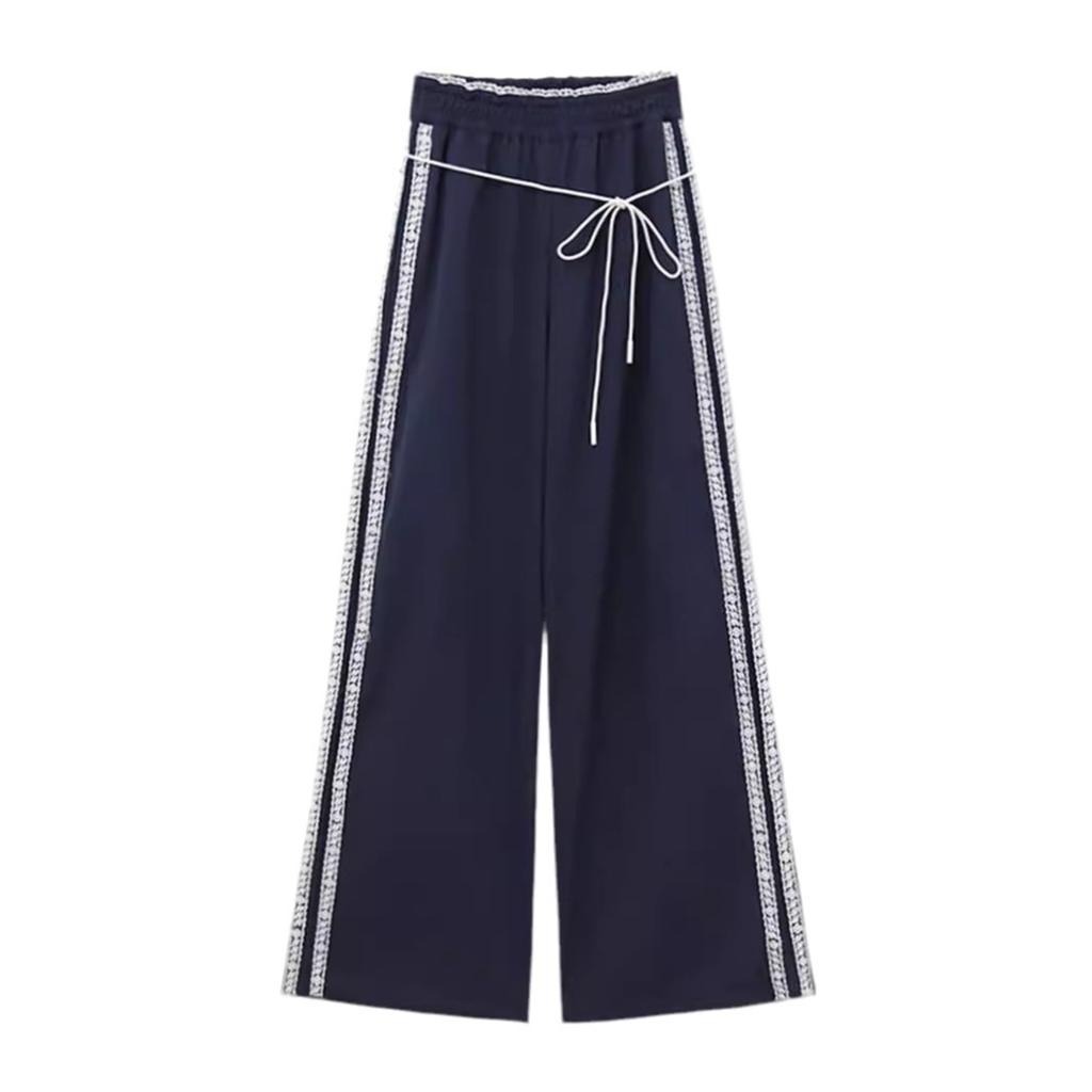 Hose mit Streifen und Spitze im koreanischen Stil für Damen, Herbstneuheit, elastische Taille, Harajuku-Stil, Freizeithose, gerade Hose