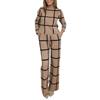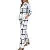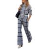 Set aus langärmligem Oberteil und Hose mit weitem Bein. Eleganter Anzug mit Karomuster und Hose mit weitem Bein. Lockere Bluse für Damen. Stilvolle Bürokleidung