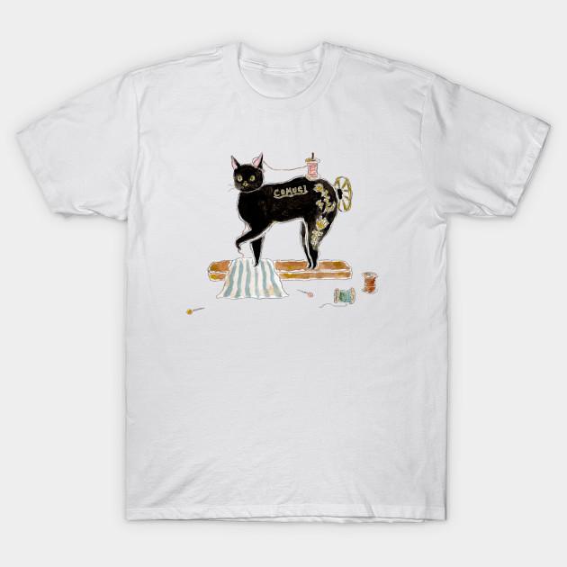 Men Black Print T-shirt Sewing Machine Cat No-Cut Transfer Paper Print Cotton Tshirt