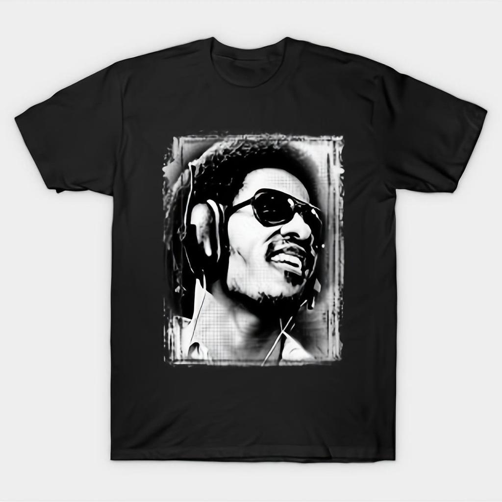 Stevie Wonder Vintage Musik Idol T-Shirt Schwarz-Weiß-Muster Kurzarm Rundhals Ganzjahreskomfort Print