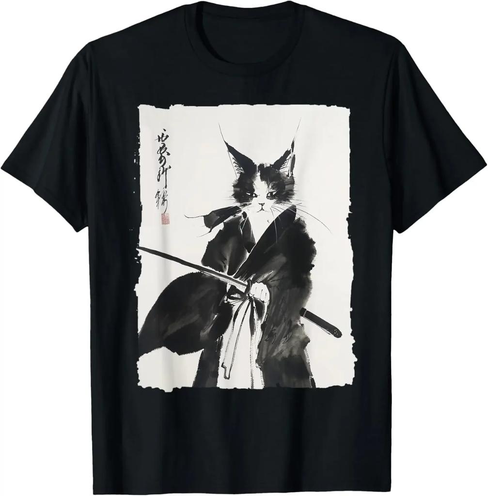 2025 Men's Samurai Cat Art Pattern Harajuku Print 100% Pure Cotton short-sleeved T-shirt Y2k Comfortable Loose top