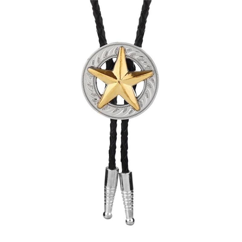 Vintage Metal Star Badge Pendant Cowboy Bolo Tie Western Faux Leather Rope Necktie Jewelry Shirt Collar Chain Necklace