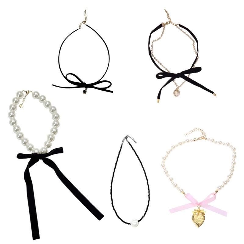 Elegant Bowknot Necklace Pearls Beads Heart Pendant Clavicle Chain French Style Collarbone Chains for Women Girls