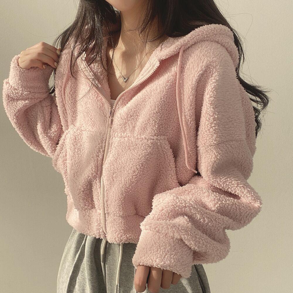 Damen Lammwolle Flauschiges Kapuzensweatshirt - Verdickter Warmer Kurzer Reißverschluss Mantel, Trendig Herbst/Winter 2025.