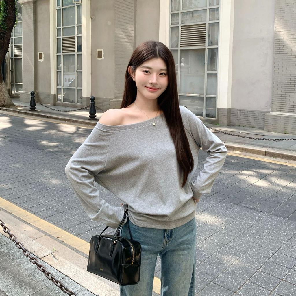 Spring and Autumn loose Off shoulder Long sleeve T-shirt Women Solid color Casual Tops Lady Basic Tees Korean style Youth Blouses