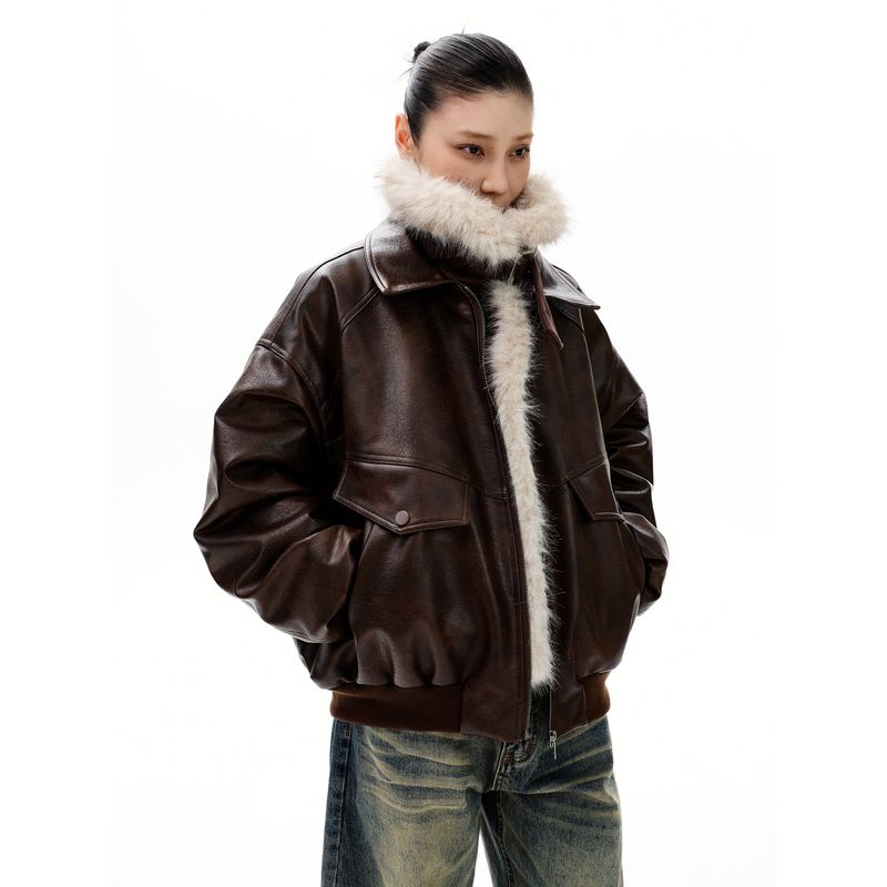 Kisko Winter American-Style Thickened Stand-Collar Leather Jacket Cotton Coat for Men and Women, High-End, Warm, Loose-Fitting Trendy Outerwear