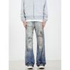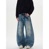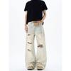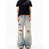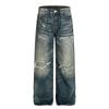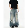 Kisko American High Street Distressed Patch Washed Whiskered Jeans Unisex Trendy Loose Straight Vibe Pants