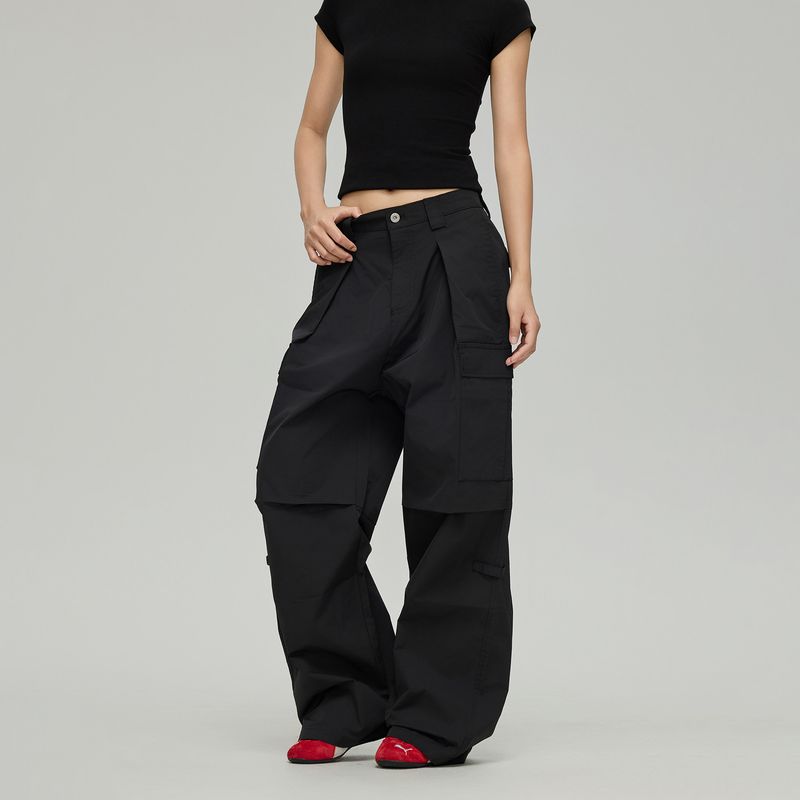 Black of Exit Trendy High-End Ribbon Straight-Leg Cargo Pants for Men and Women, Slightly Flared, Wide-Leg, Slimming Casual Pants