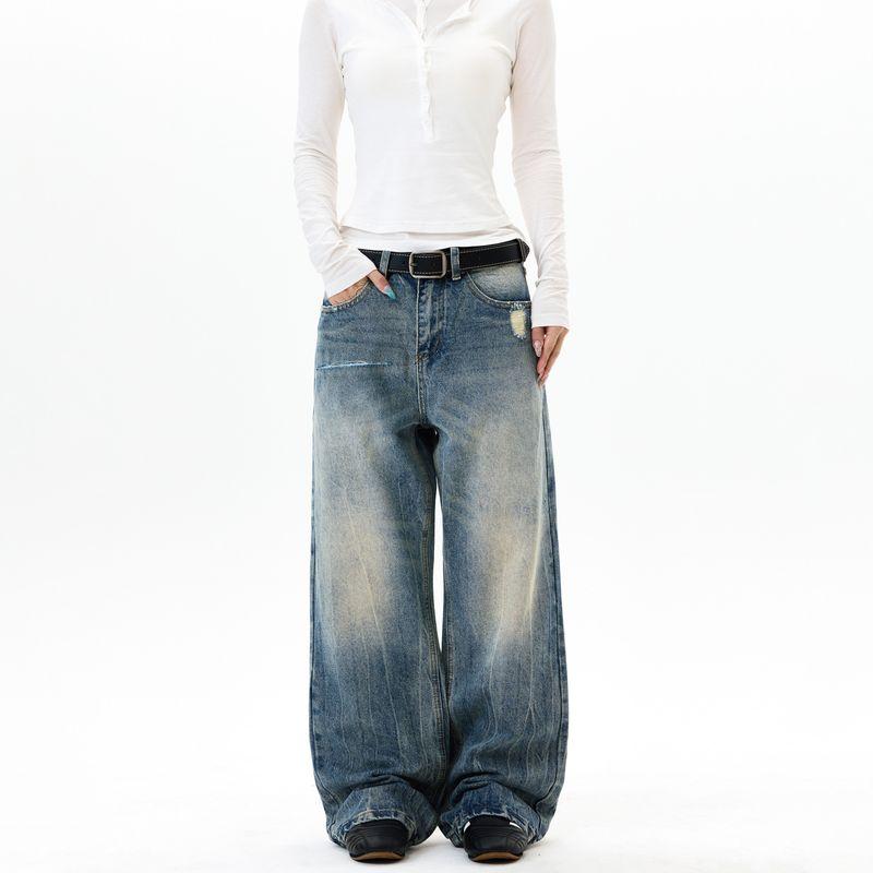 Kisko American-Style Washed Cracked Straight-Leg Drapey Jeans for Men and Women, Cool and Clean Fit, Slimming Pants, Trendy