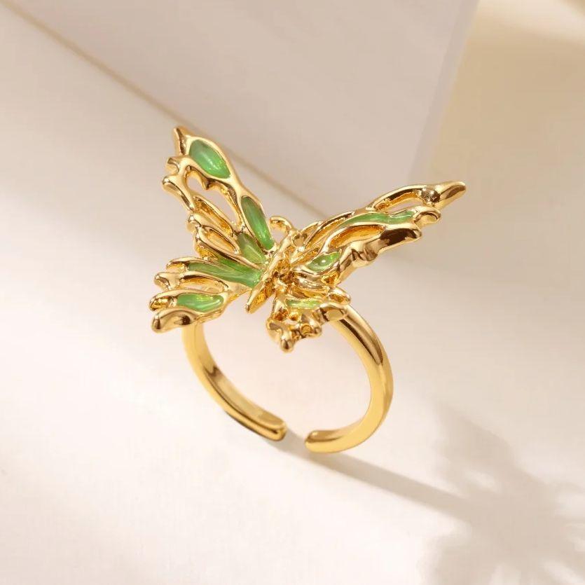 Green Oil-Dripping Butterfly Rings For Women Gold Color Vintage Geometric Butterfly Opening Ring Wedding Aesthetic Jewelry Gift